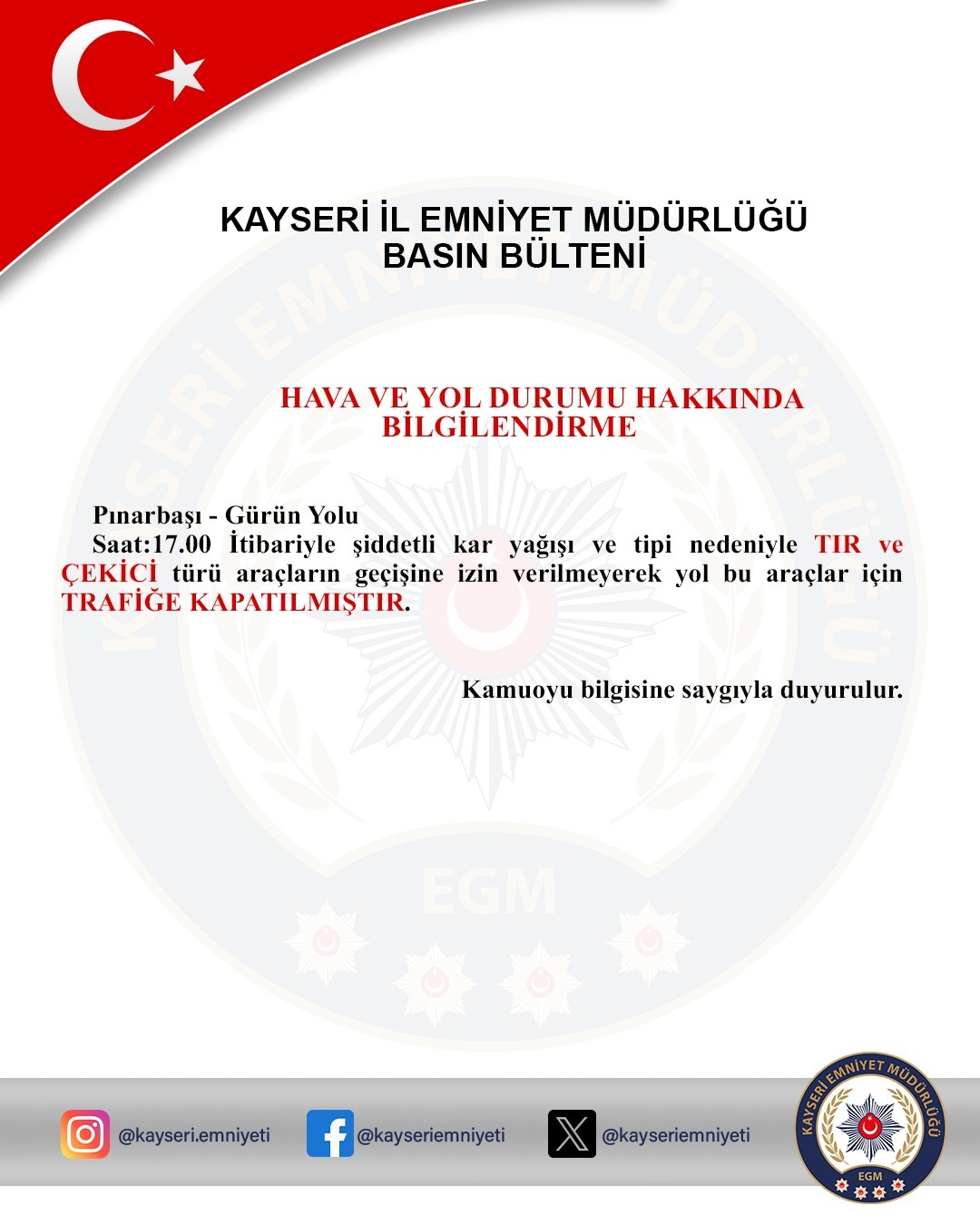 Pınarbaşı-Gürün Karayolu şiddetli kar yağışı ve tipi nedeniyle saat 17:00 itibariyle tır ve çekici türü araçların geçişine izin verilmeyecek şekilde trafiğe kapatıldı.Kayseri İl Emniyet Müdürlüğü Trafik Denetleme Şube Müdürlüğü’nün hava ve yol durumu hakkında yapmış olduğu bilgilendirmelere göre; Pınarbaşı-Gürün Karayolu şiddetli kar yağışı ve tipi nedeniyle saat 17:00 itibariyle tır ve çekici türü araçların geçişine izin verilmeyecek şekilde trafiğe kapatıldı.